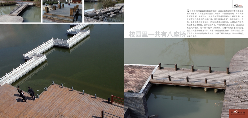 为什么不大的校园就有如此多的桥,盖因在新校建设时不但未填掉 原有的水面,反而通过淘沟挖渠,又修筑了一面新的湿地,并将其纳入原有水系,通新连扩,使各式新设计建造的跨水之桥有七座,加之原有的九曲桥共达八条之多。因校园园内景观一向崇尚质朴、自然、略带优雅的松弛倾向,所以材质基本以钢材、木材为主作组合。形状不作过多矫饰,以方块状为主,中间用黑色铁链衔接,添几许古典欧风的雅致。有一座干脆以石块垒成,石缝中暗藏丰水时的溢道,使之与周遭景观融为一体。其中一座跨度最长的桥,在桥栏形式上作了左右材质和形状的不对称处理,加强了设计的痕迹。桥——欲将艺术融入生活。