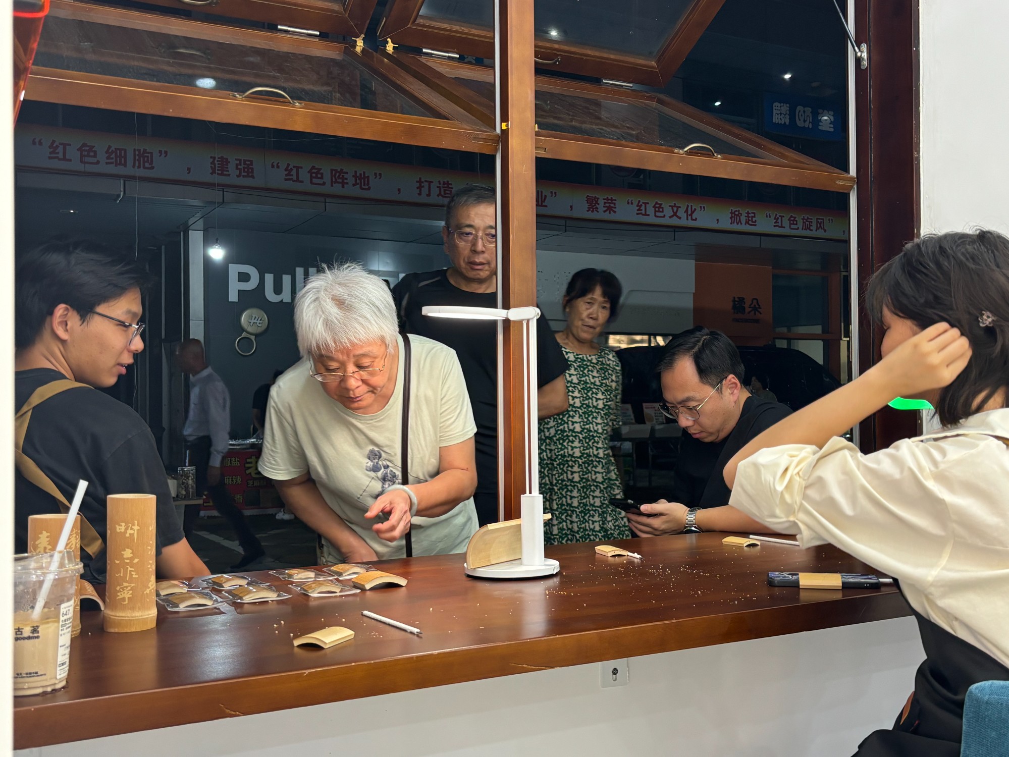 月满中秋,情聚双桂。9月30日下午,南大街街道双桂坊社区迎来了一年一度的“月满中秋‘摊’玩一下”中秋集市活动。受社区邀请,常州艺术高等职业学校艺术设计系非遗导师徐雪草带领3名非遗专业学生走进商圈会客厅,以“留青竹刻”这门古老技艺,在现代商圈里完成了一次生动的“活化”实践。
