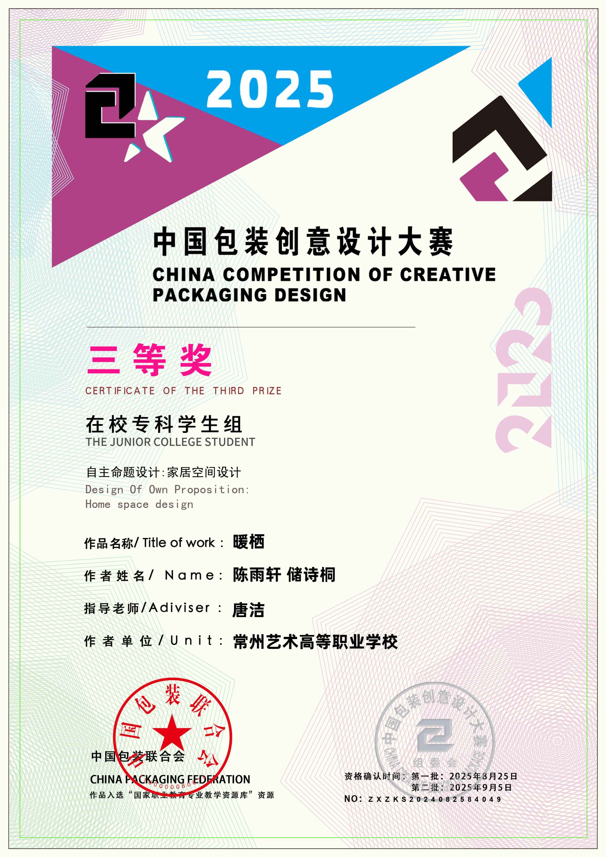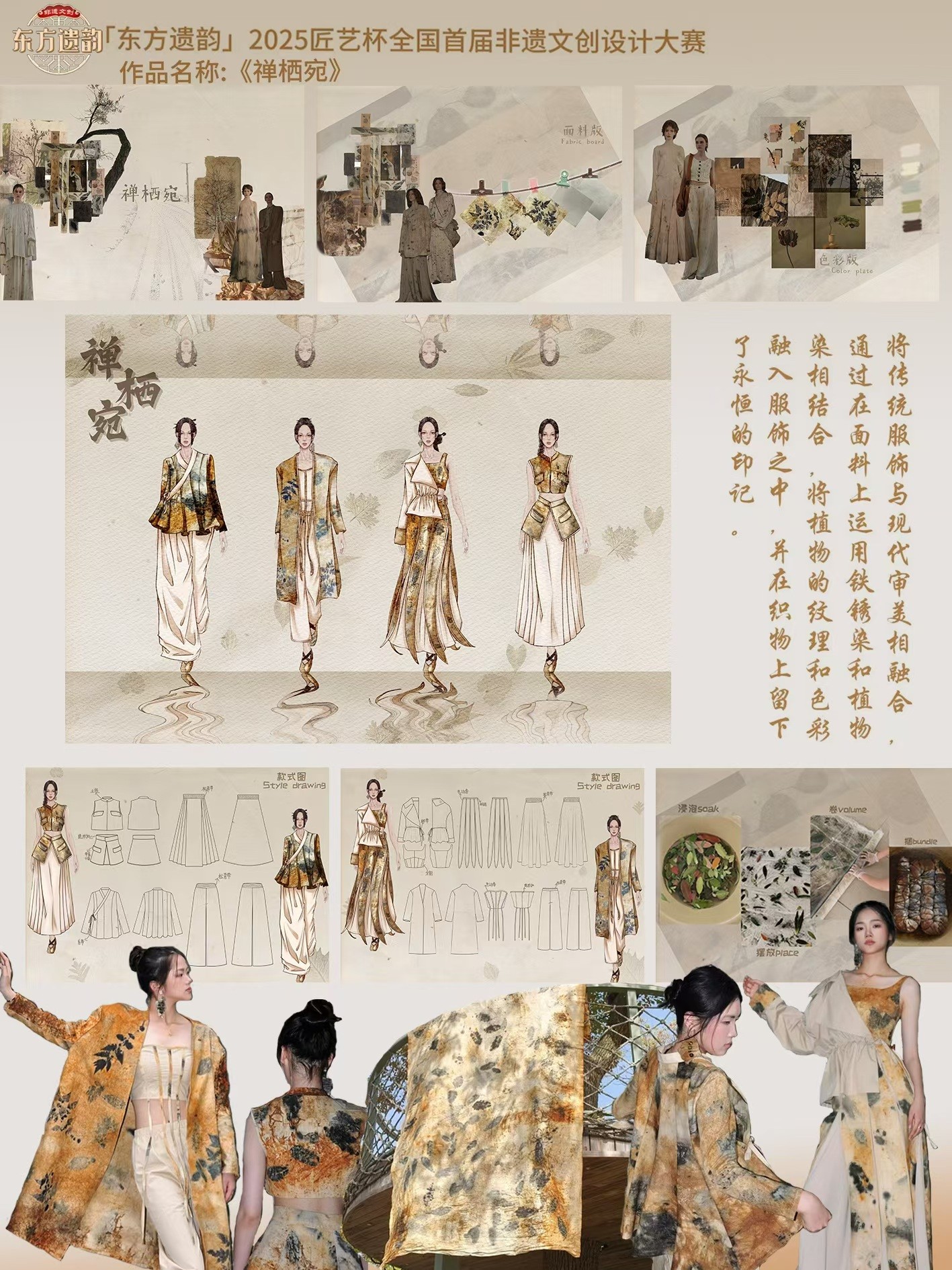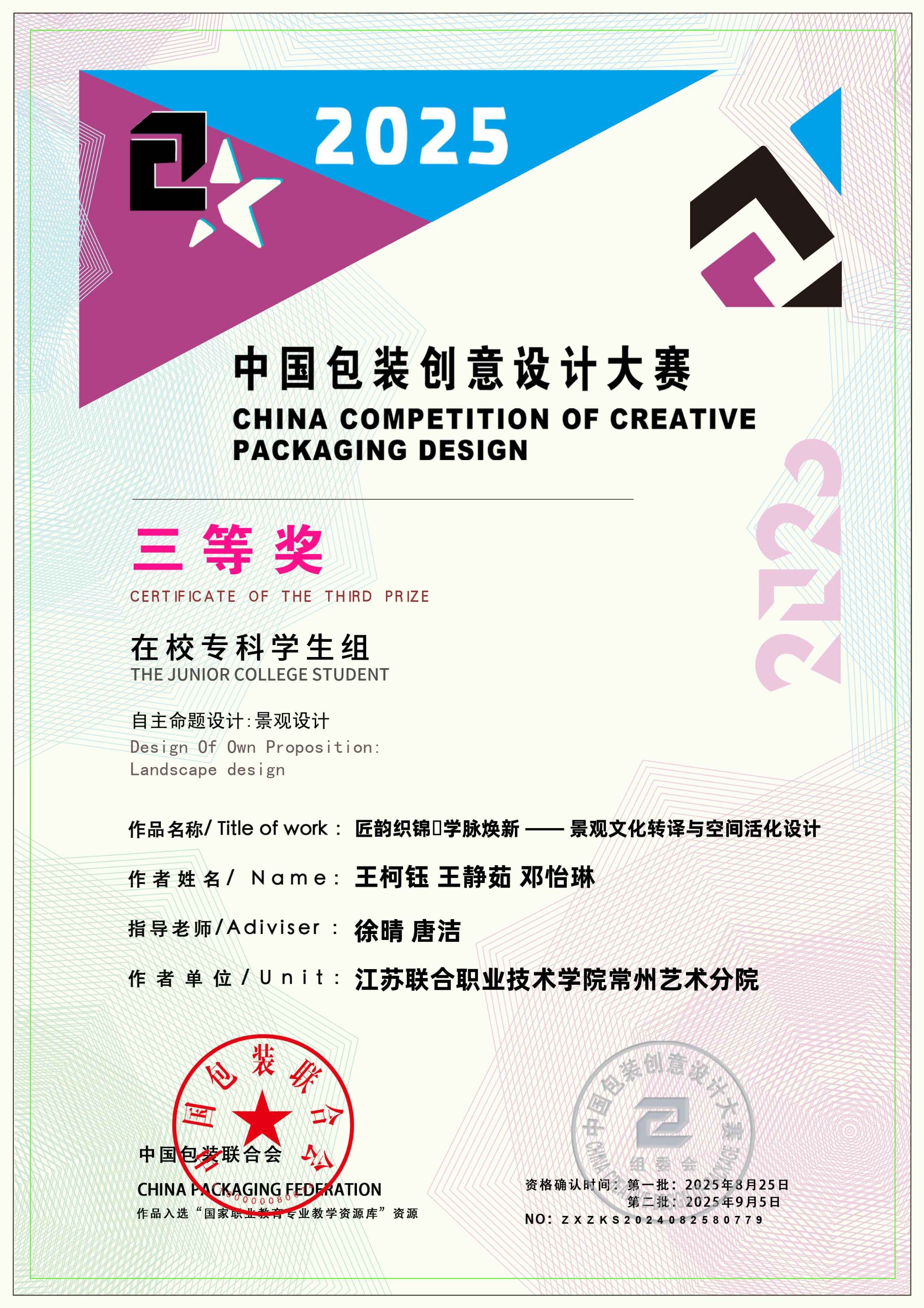 在“2025匠艺杯全国首届非遗文创设计大赛”中,我校作品《禅栖宛》(作者:21服装班李苗苗、侯文静,指导老师:汪烨)、《两仪》(作者:21服装班徐佳慧,指导老师:汪烨)顺利入围2025匠艺杯全国首届非遗文创设计大赛全国总决赛。在“2025中国包装创意设计大赛”中,我校作品《匠韵织锦·学脉焕新——景观文化转译与空间活化设计》(作者:21环艺班王珂钰、王静茹、邓怡琳,指导老师:徐晴、唐洁)、《暖栖》(作者:22环艺班陈雨轩、储诗桐,指导老师:唐洁)荣获全国三等奖。在“中国好创意(第十九届)暨全国数字艺术设计大赛”中,我校作品《颐居》(作者:22环艺班陈雨轩、储诗桐,指导老师:唐洁)荣获高职组二等奖。